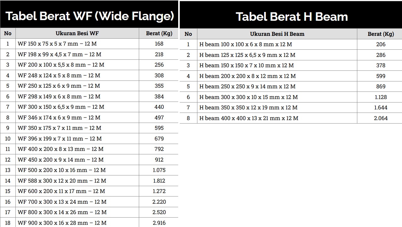 IWF dan H-Beam tersedia dalam berbagai jenis berdasarkan ukuran, bentuk, dan materialnya: